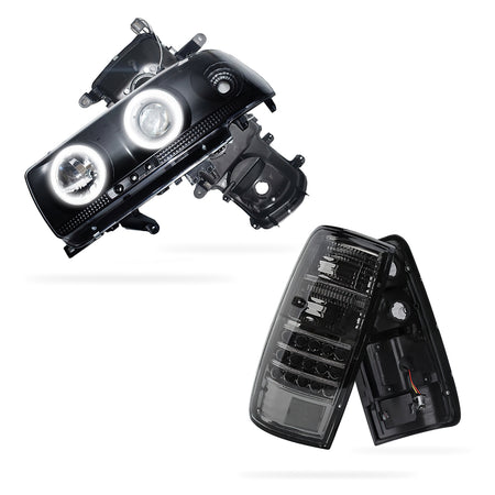 - Complete Bundle (LH + RH): Smoked Tail Lights + Halo Angel Eyes Projector Headlights